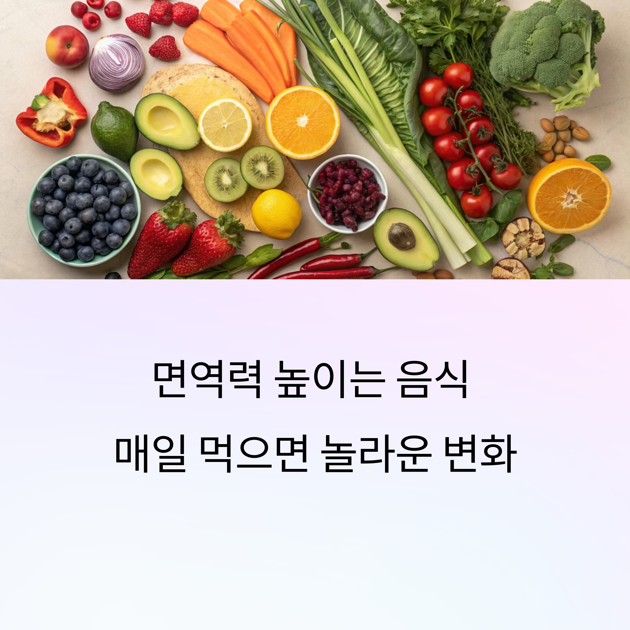 매일 면역력을 높이면 어떤 변화가 생길까?목차면역력 높이는 음식, 매일 먹으면 놀라운 변화 면역력의 비밀 - 왜 매일 관리해야 할까요? 면역력 높이는 대표 음식 - 슈퍼푸드 소개 제철 과일과 채소 - 자연이 준 선물 발효 식품의 힘 - 장 건강과 면역의 연결고리매일 챙기기 좋은 간단 레시피 음식 외에도 중요한 생활 습관 잘못된 건강 상식 바로잡기 꾸준히 먹었을 때 일어나는 몸의 변화 관리는 왜 매일 신경 써야 할까? "건강은 하루아침에 무너지지 않습니다. 작은 습관이 면역력을 만듭니다." 우리 몸은 매일 외부의 바이러스와 싸우고 있습니다.특히 스트레스, 수면 부족, 영양 불균형은 면역력을 약화시킵니다.따라서 매일 꾸준히 관리하는 것이 필수입니다.몸이 보내는 작은 신호를 무시하지 말아야 합니다. 면역력을 ..