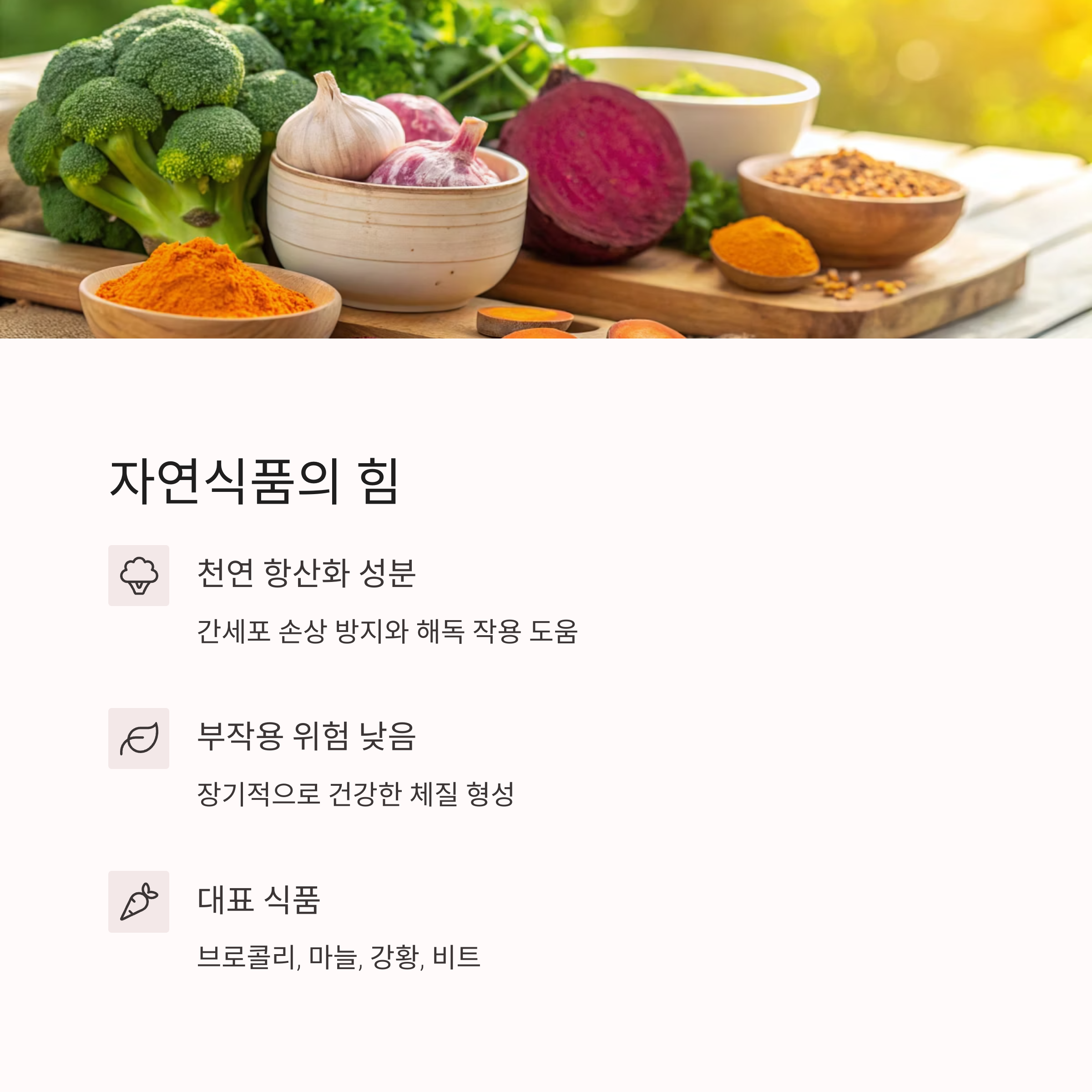 - 자연식품에는 간에 무리가 가지 않는 천연 항산화 성분이 풍부합니다.