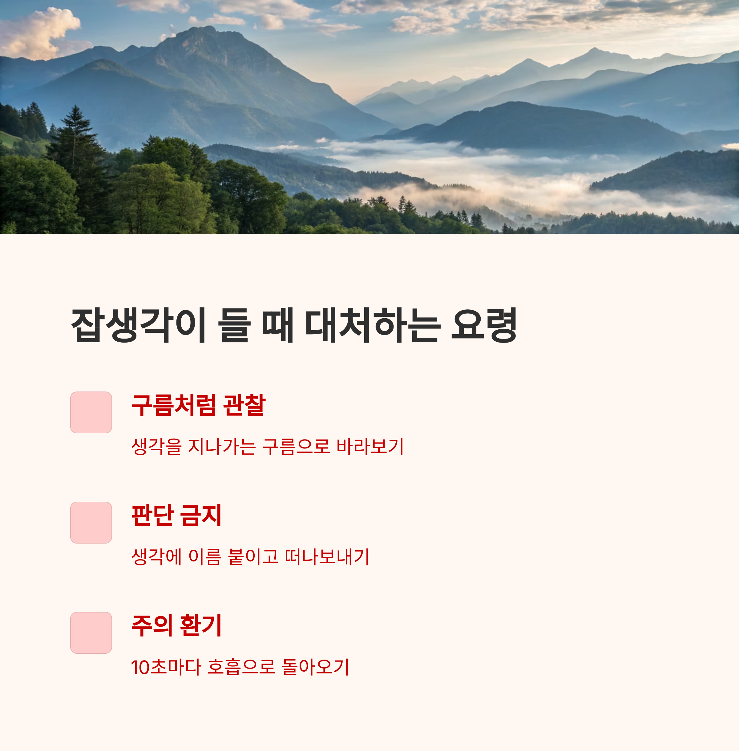 "생각이 드는 것을 억지로 막지 말고, 구름이 흘러가듯 관찰하세요."