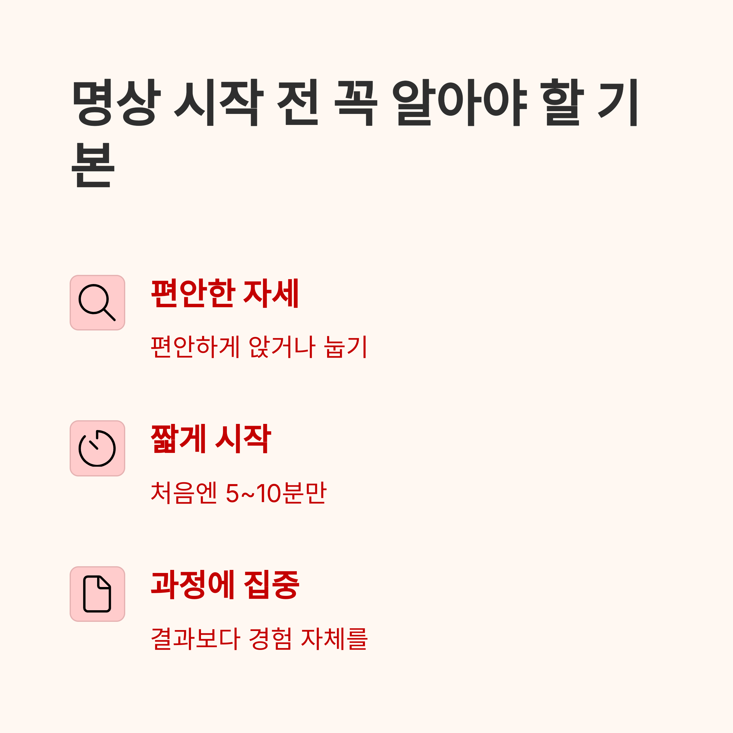 - 생각이 떠오르면, 그냥 흘려보내고 다시 호흡에 집중합니다.
