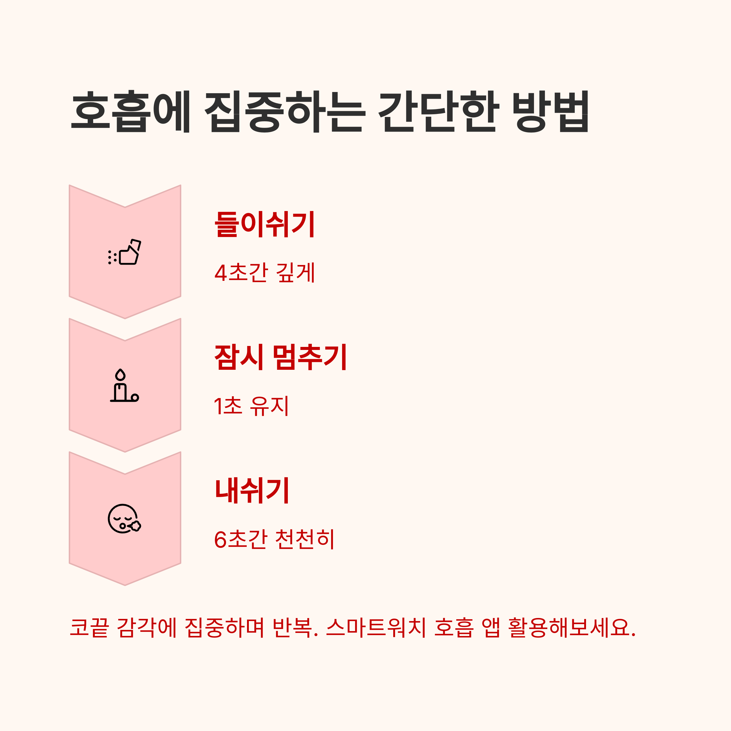 "4초 들이마시고, 6초 내쉬기"처럼 간단한 리듬을 정하면 훨씬 수월해집니다.