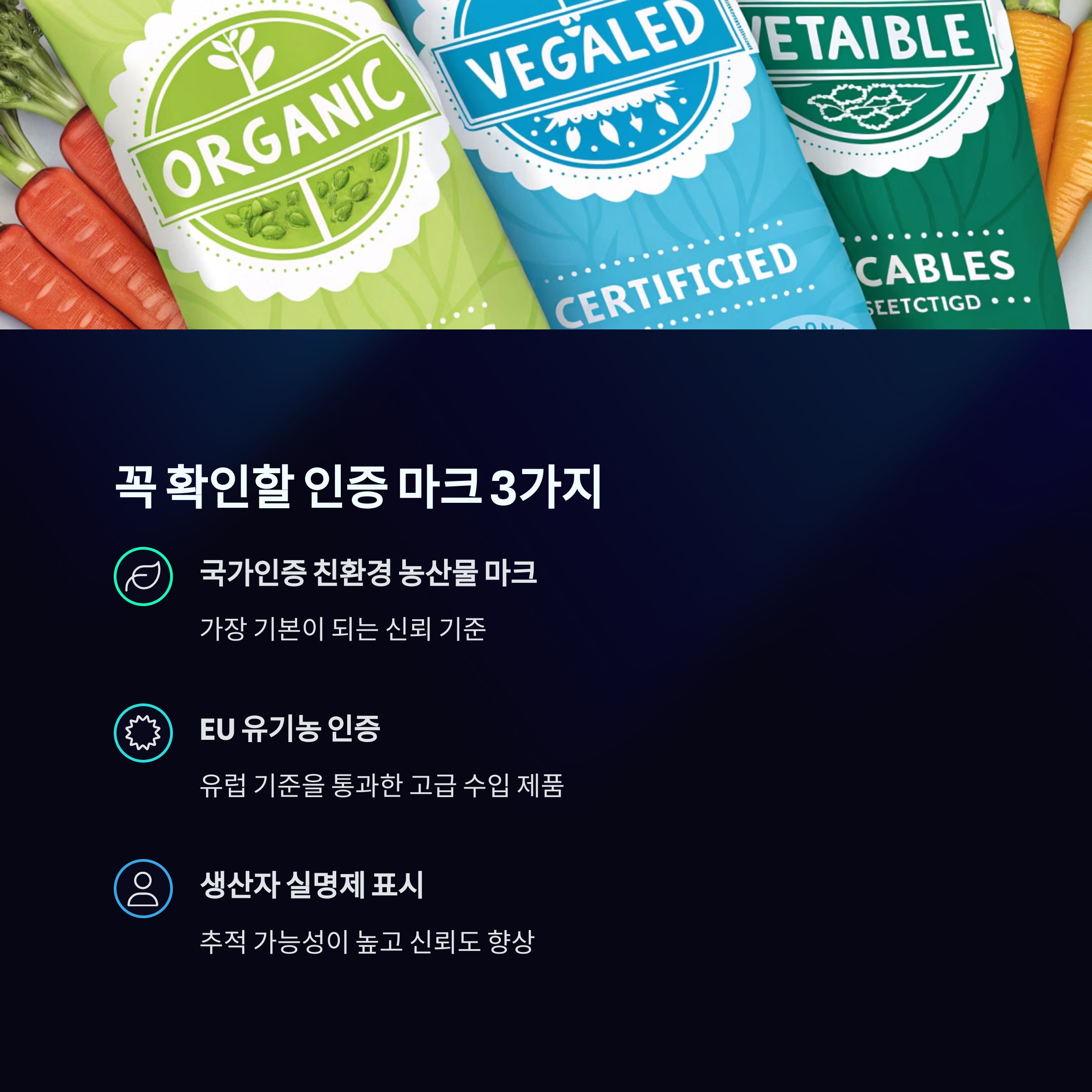 - 국가인증 친환경 농산물 마크 (녹색 잎 모양): 가장 기본이 되는 신뢰 기준