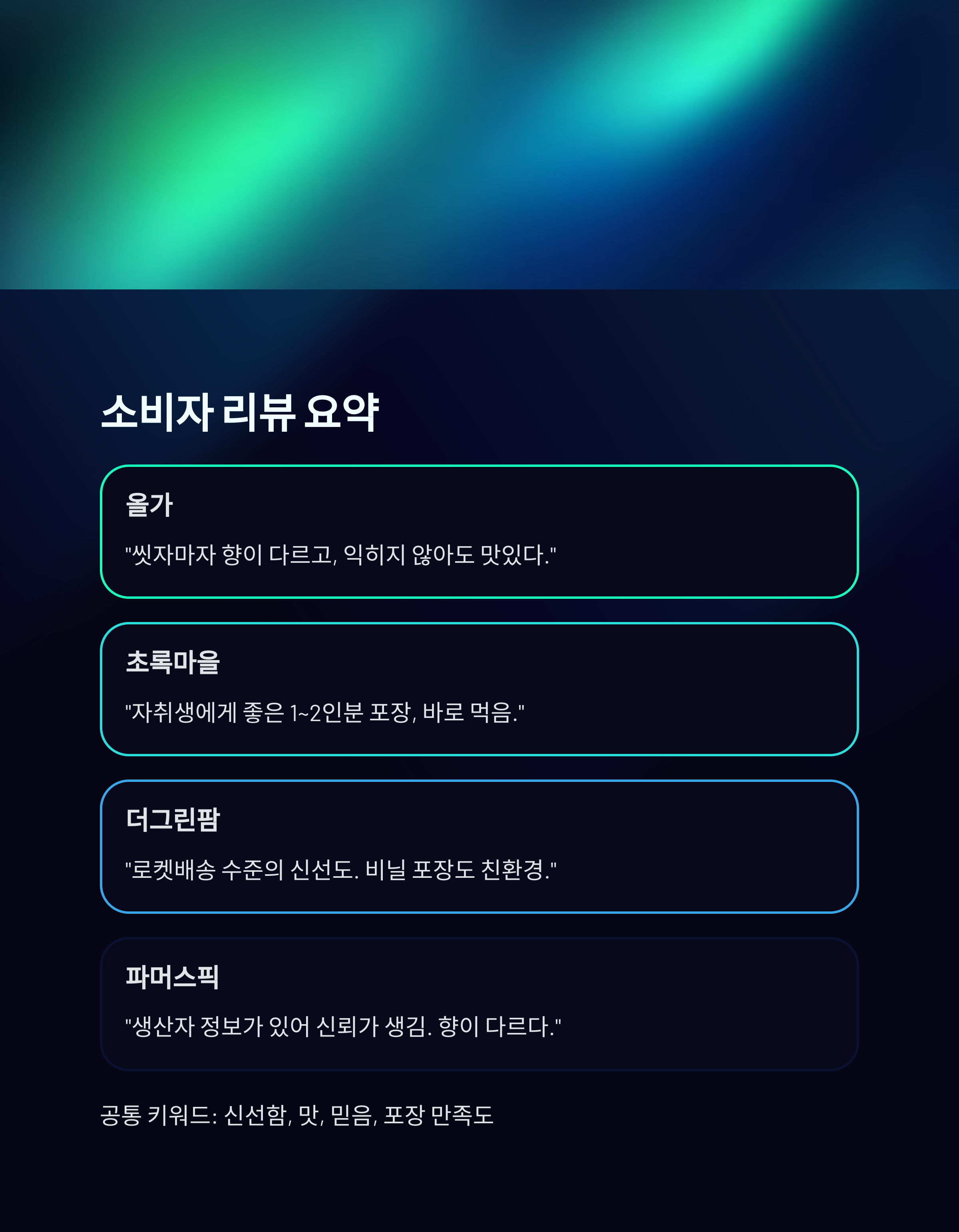 공통적으로 강조된 키워드는 신선함, 맛, 믿음, 포장 만족도였습니다.