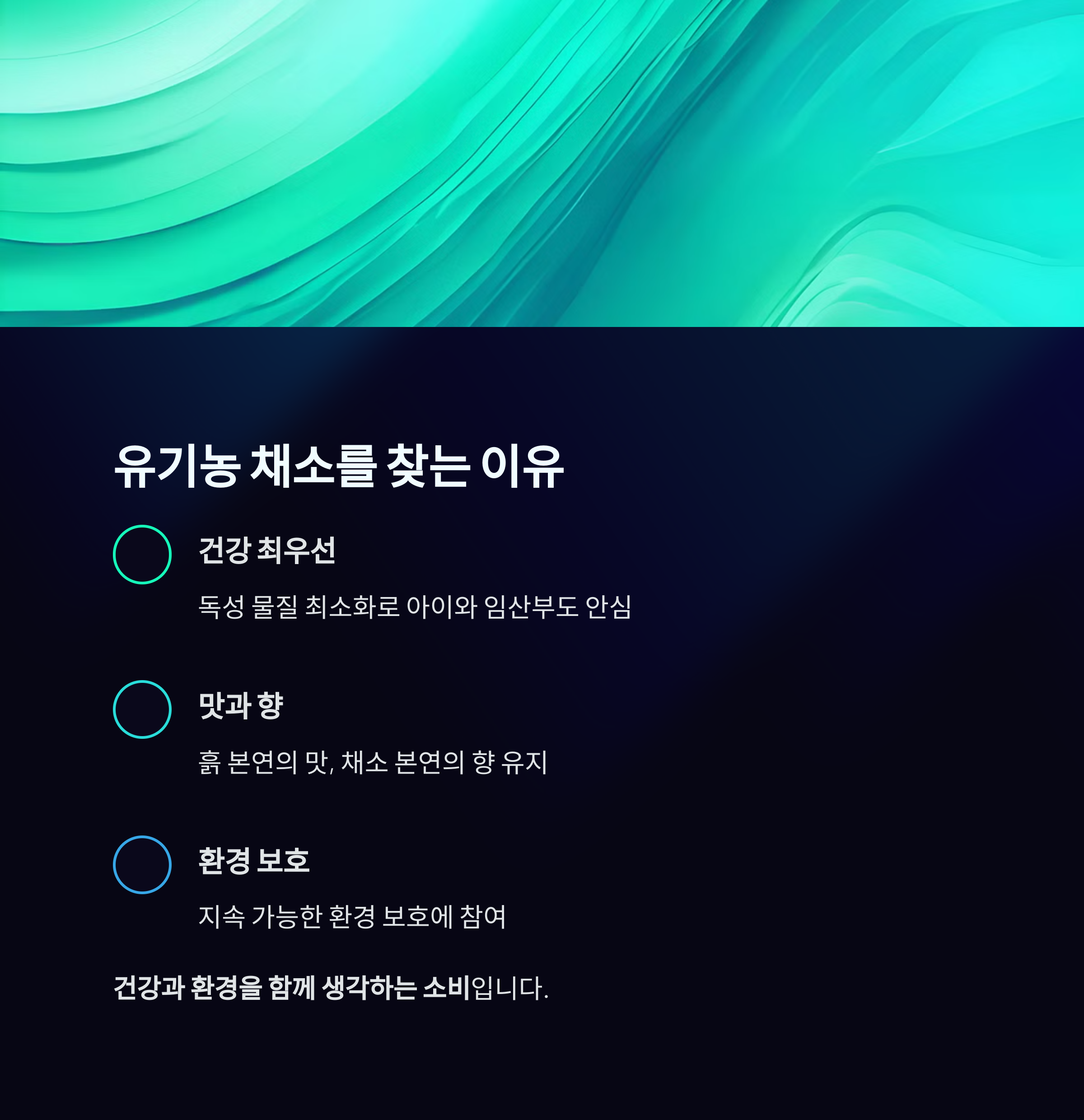즉, 유기농은 단순한 '먹거리 선택'이 아니라, 건강과 환경을 함께 생각하는 소비입니다.