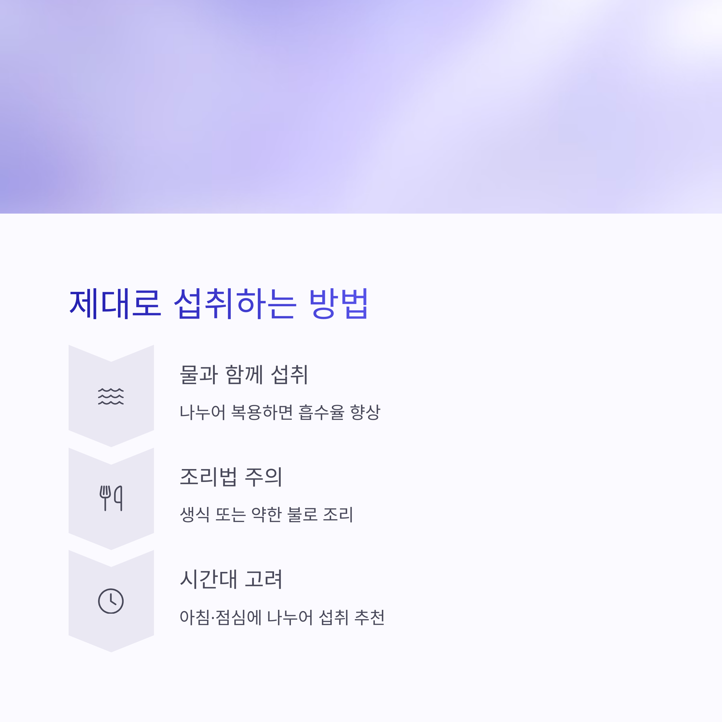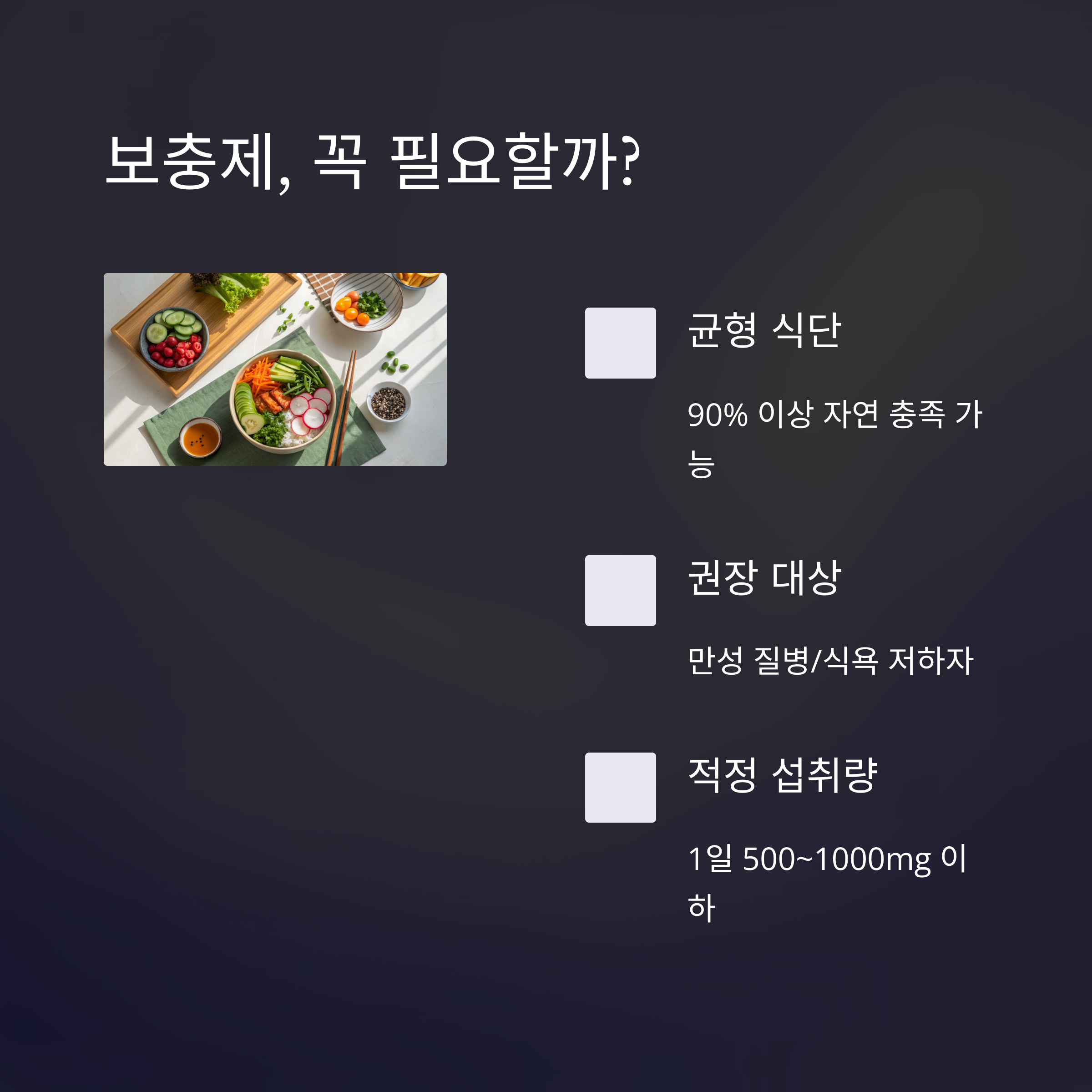 - 보충제를 먹을 때는 공복 대신 식후에 섭취하면 위 부담이 적습니다.