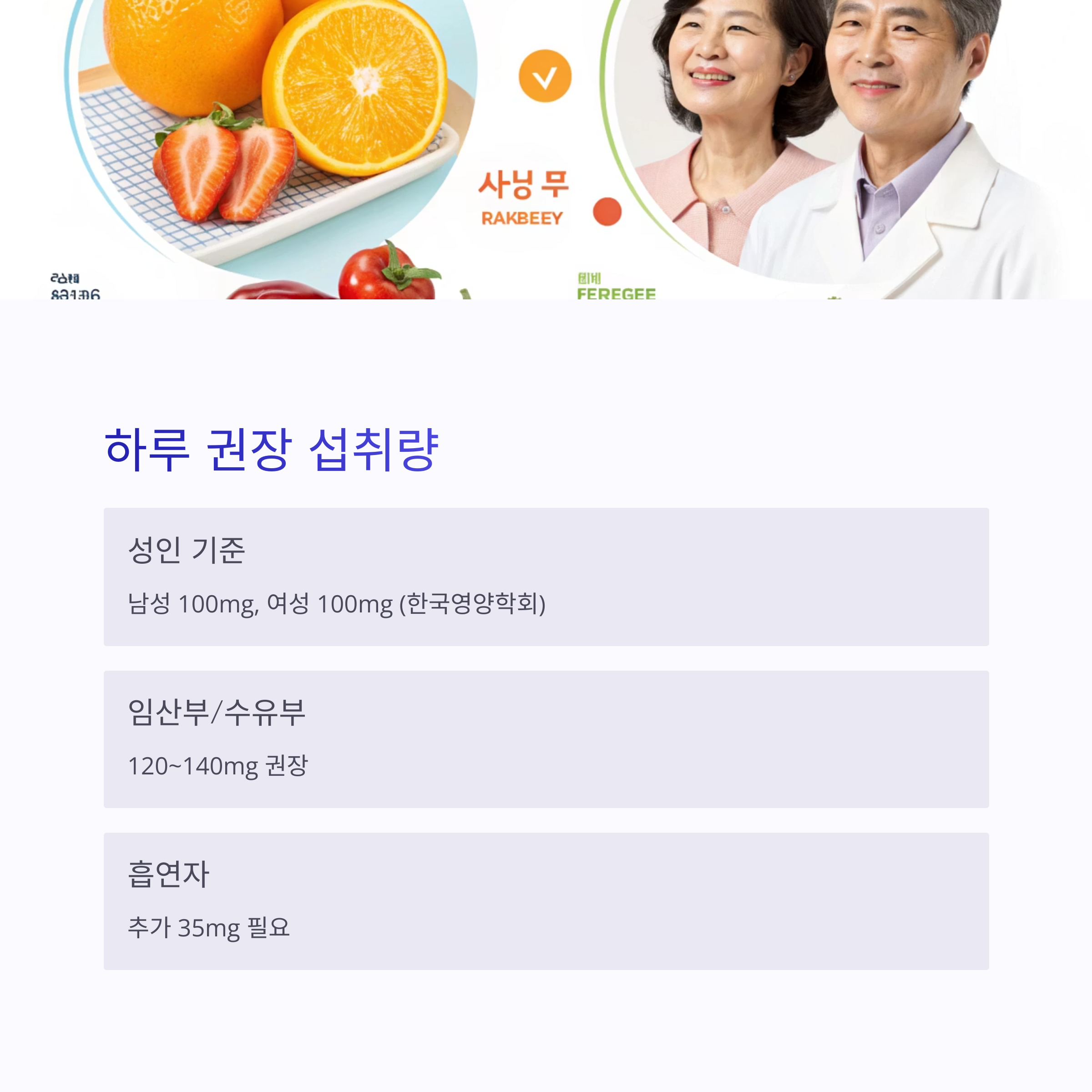 성인 기준 비타민C 권장 섭취량은 하루 약 100mg입니다.