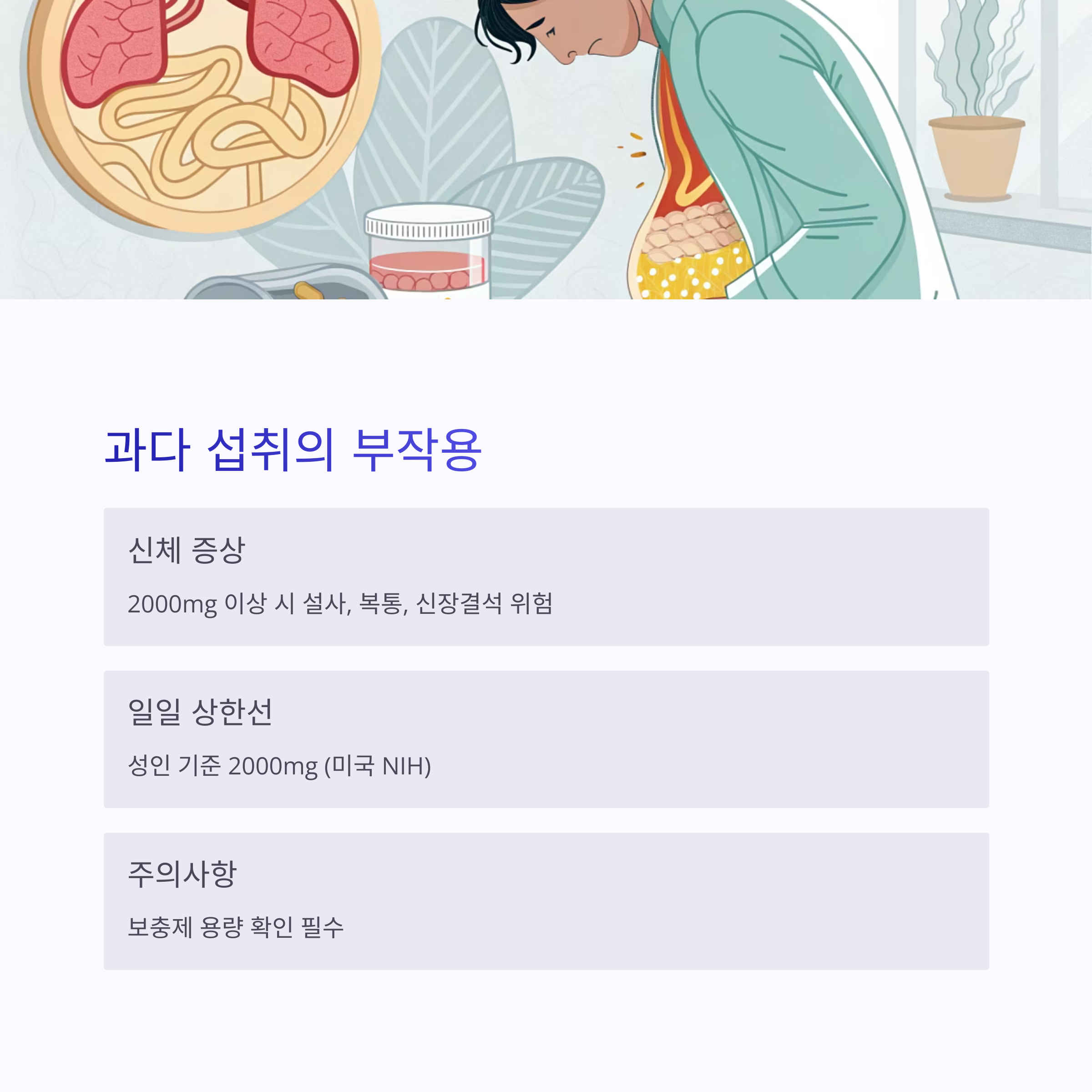 과다 섭취 시 복통, 설사, 신장결석 위험이 증가할 수 있습니다.