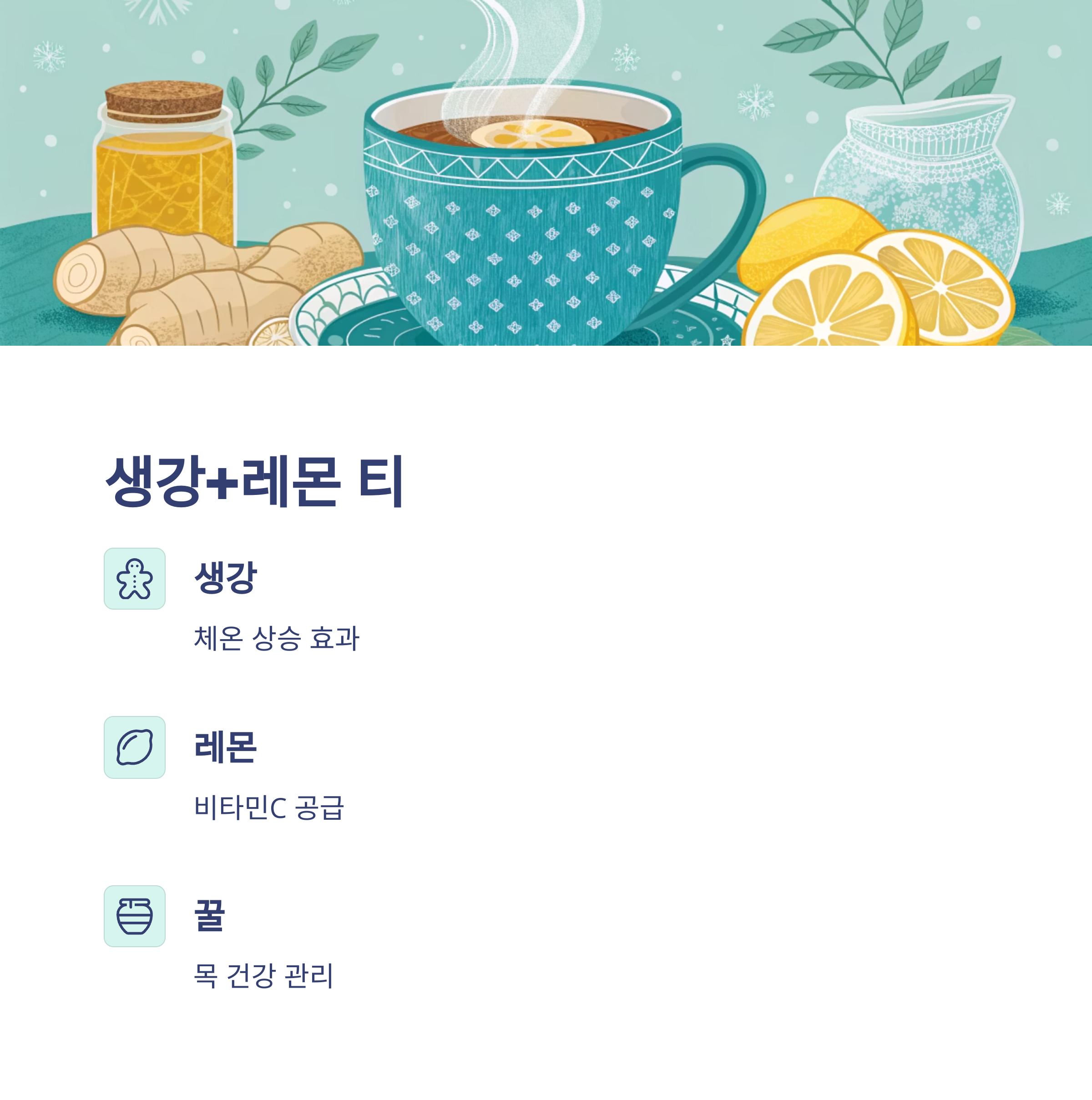 "생강 3~4조각 + 뜨거운 물 + 레몬즙 + 꿀"
