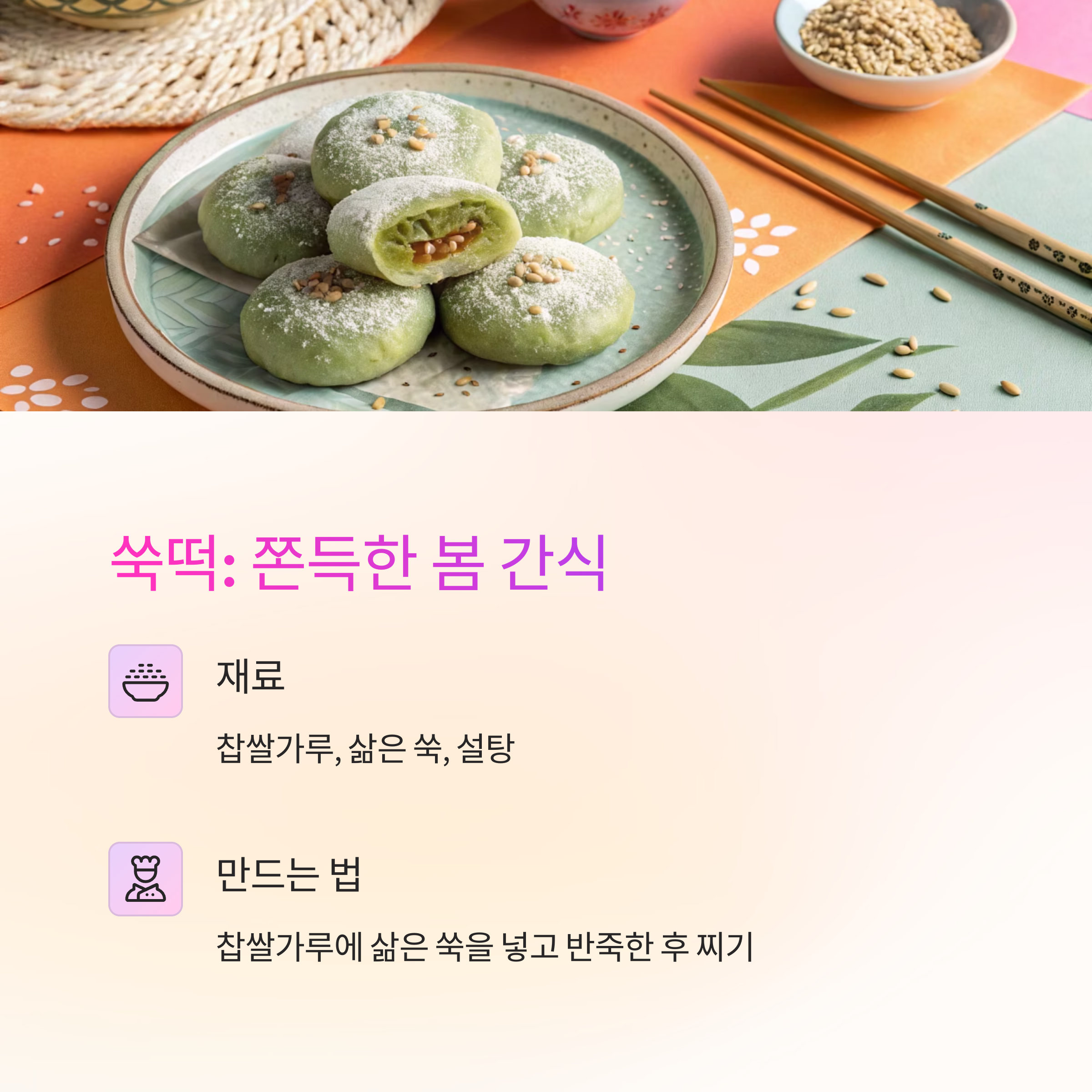 | 쑥떡 | 삶은 쑥 | 부드럽고 쫀득한 식감 |