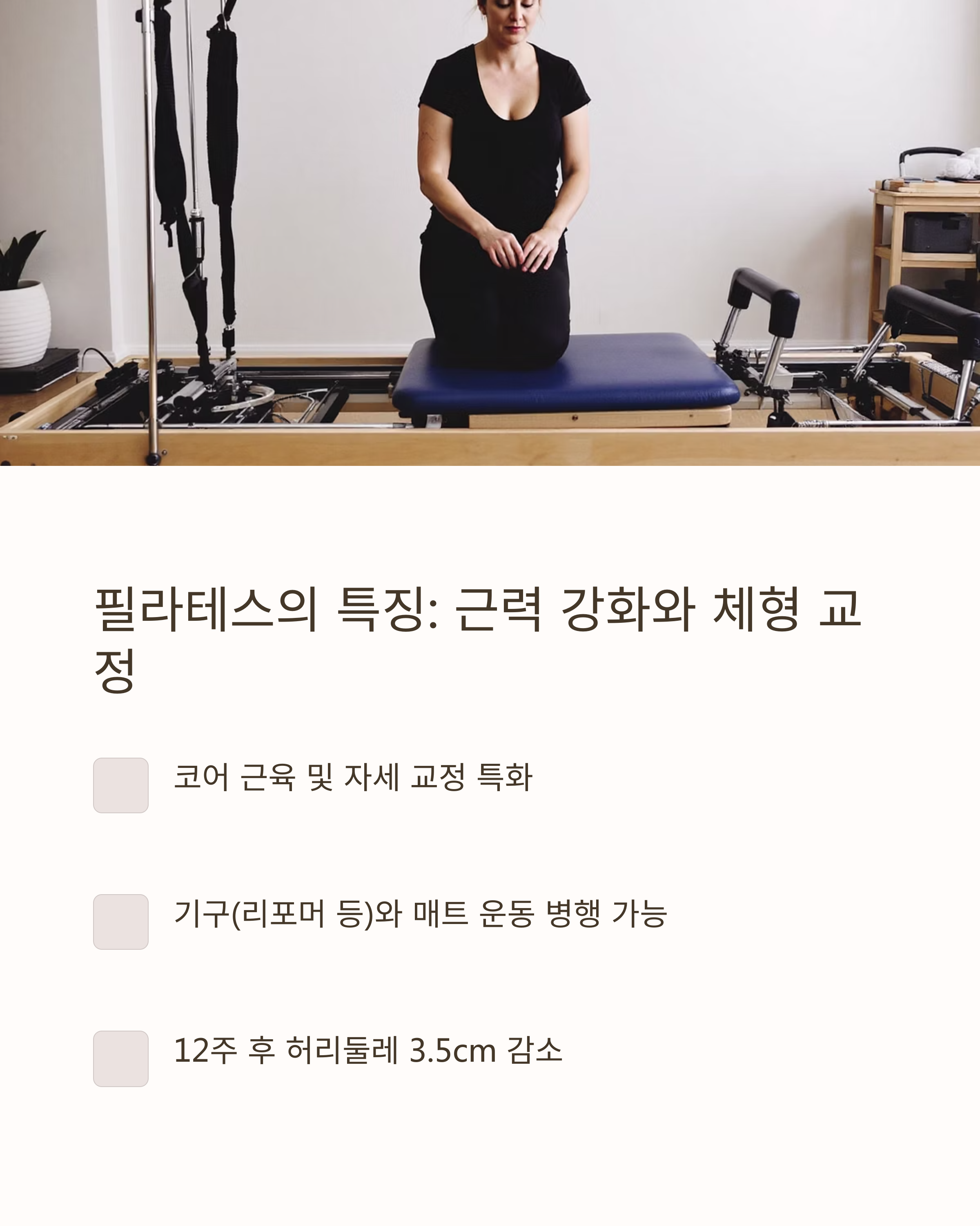 반면 필라테스는 "신체의 균형 잡힌 근력 강화"에 초점을 둡니다.