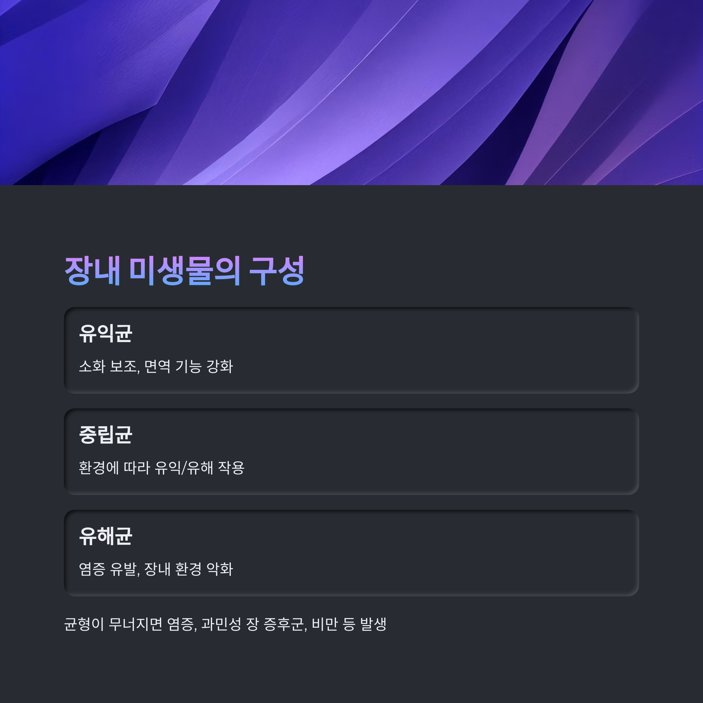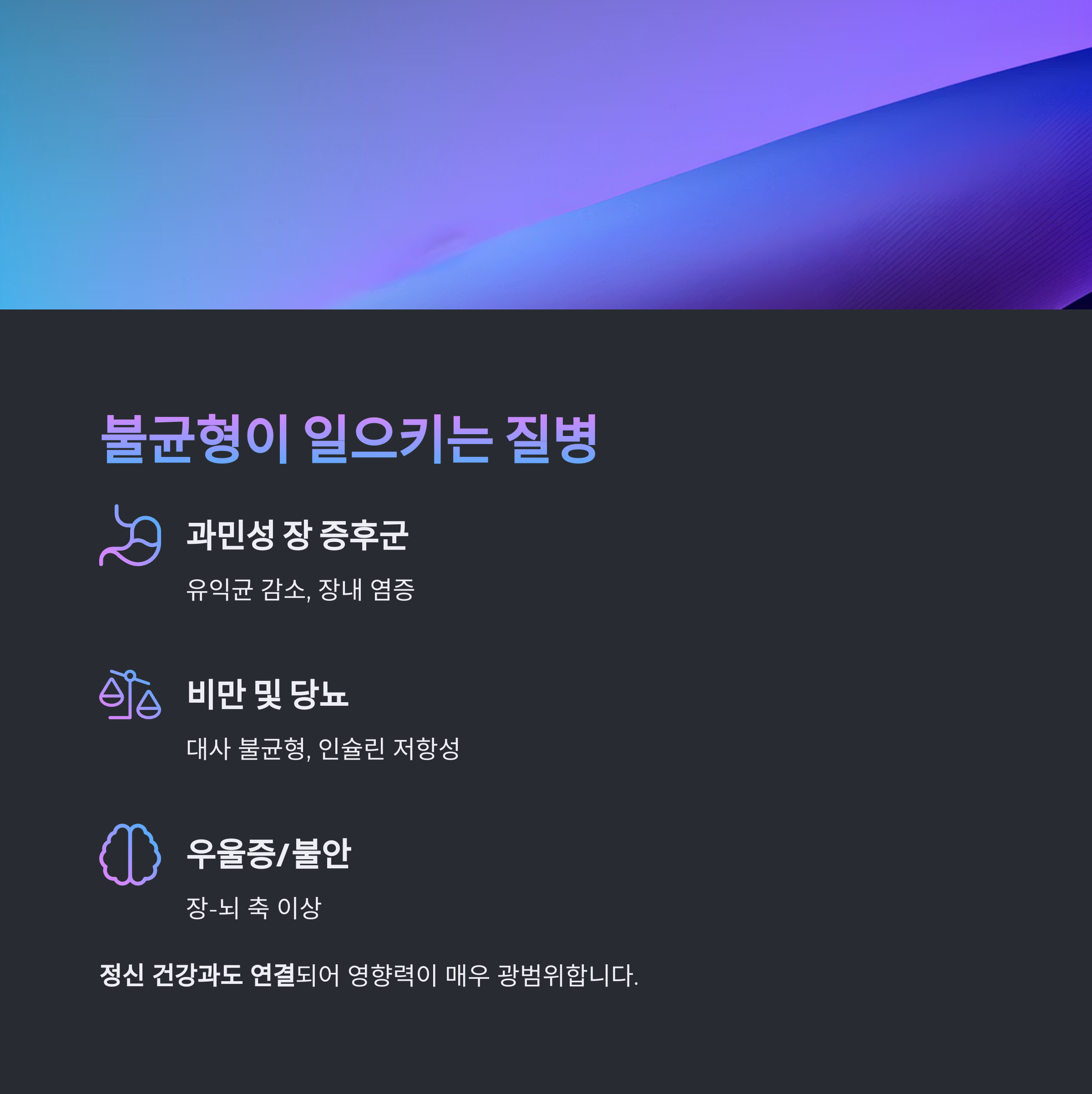 이 균형이 무너지면 염증, 과민성 장 증후군, 비만 등 다양한 문제가 발생합니다.