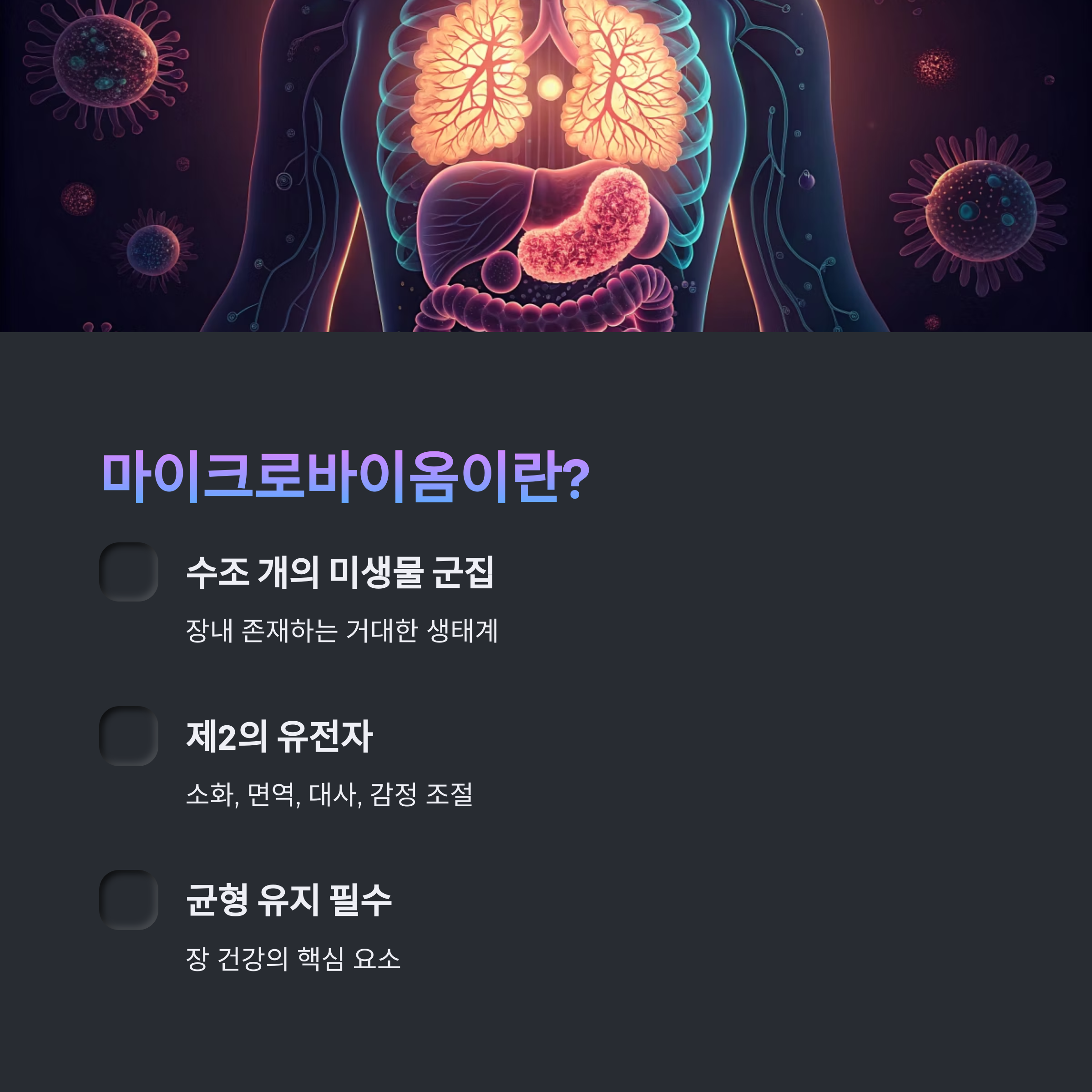 장 건강을 위해서는 마이크로바이옴의 균형 유지가 필수입니다.
