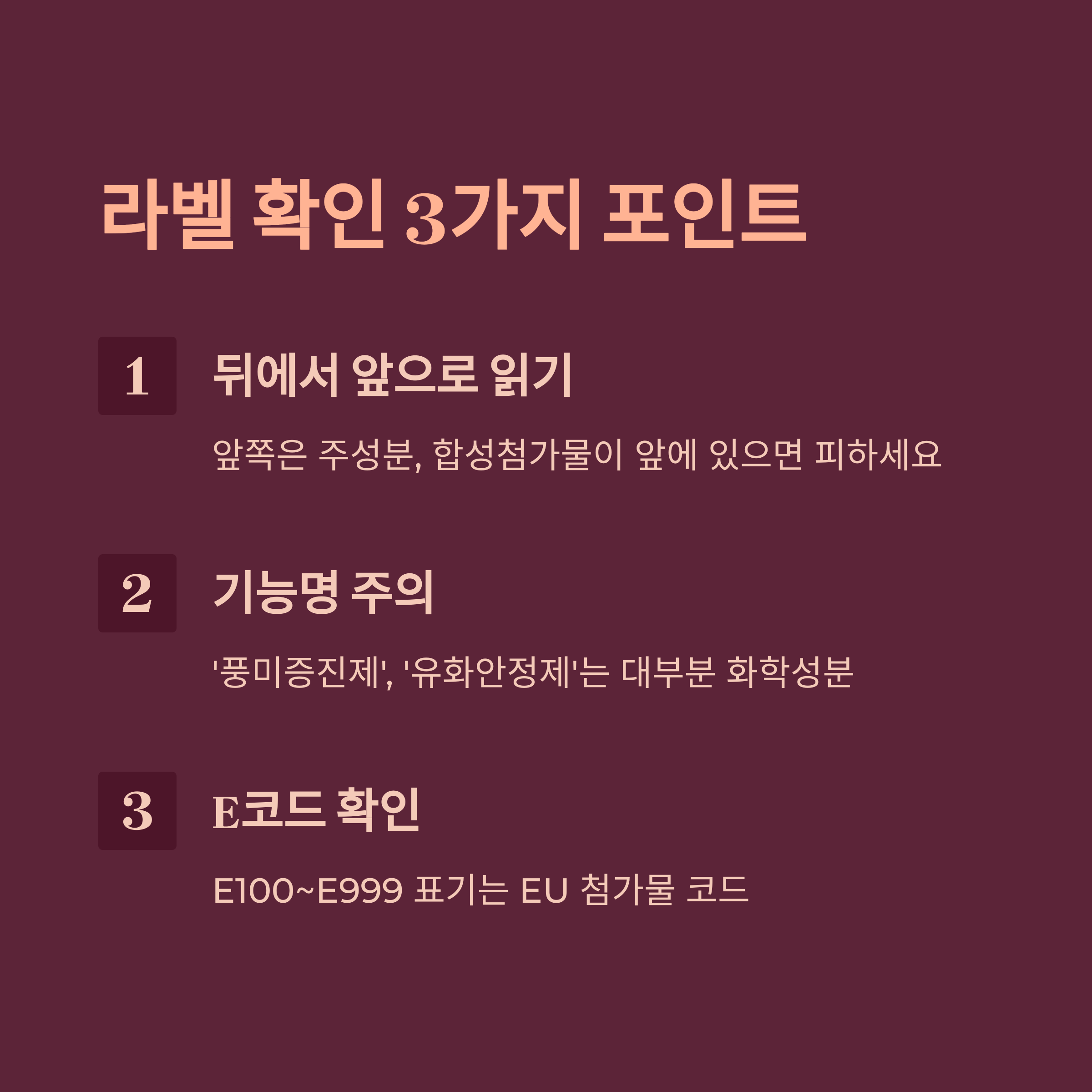 → 뒤에 있을수록 소량, 앞쪽은 주성분. 합성첨가물이 앞에 있으면 피해야 함 - 이름 대신 ‘기능’으로 숨긴 첨가물 주의