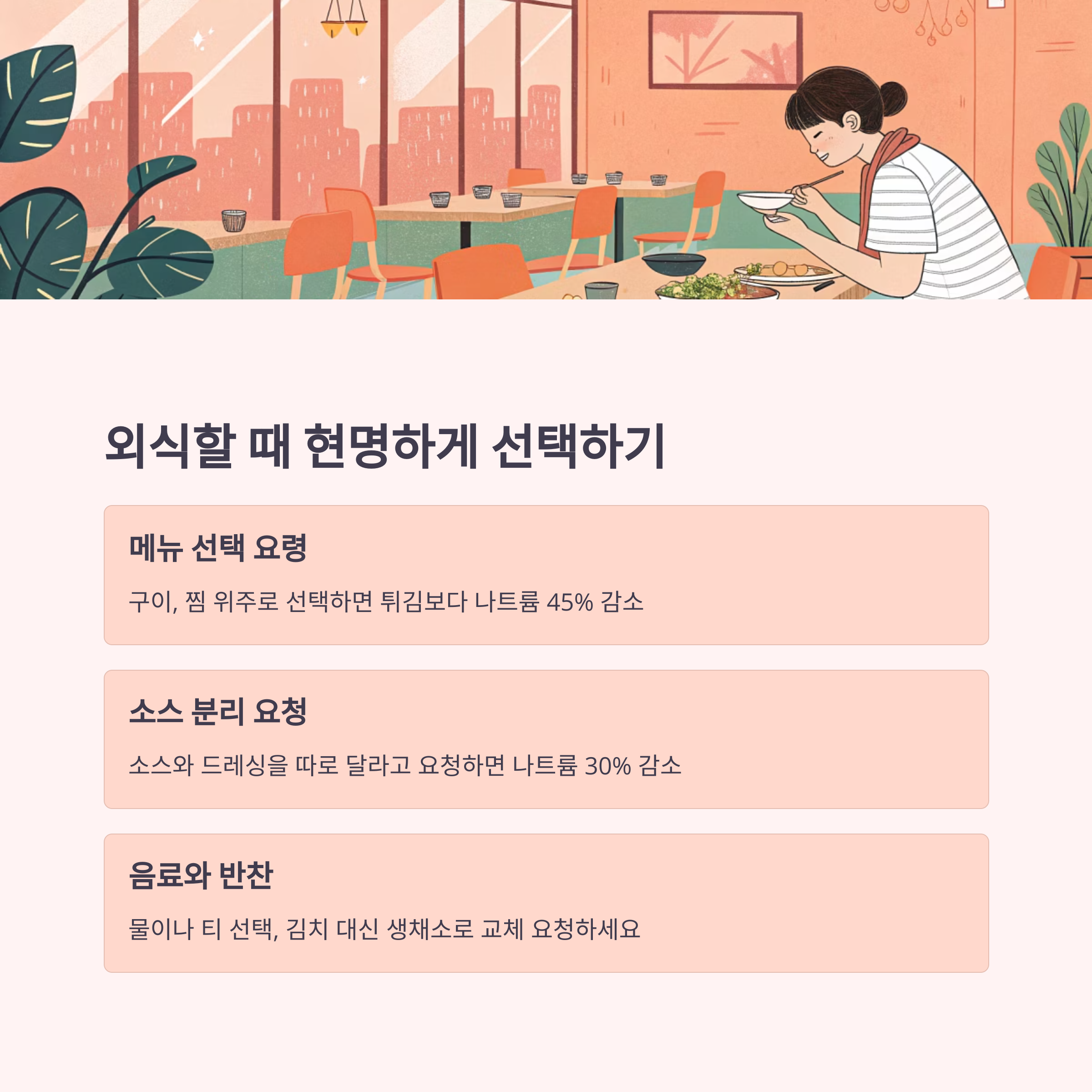 외식이 불가피할 때도 저염 저당 원칙을 유지할 수 있습니다.