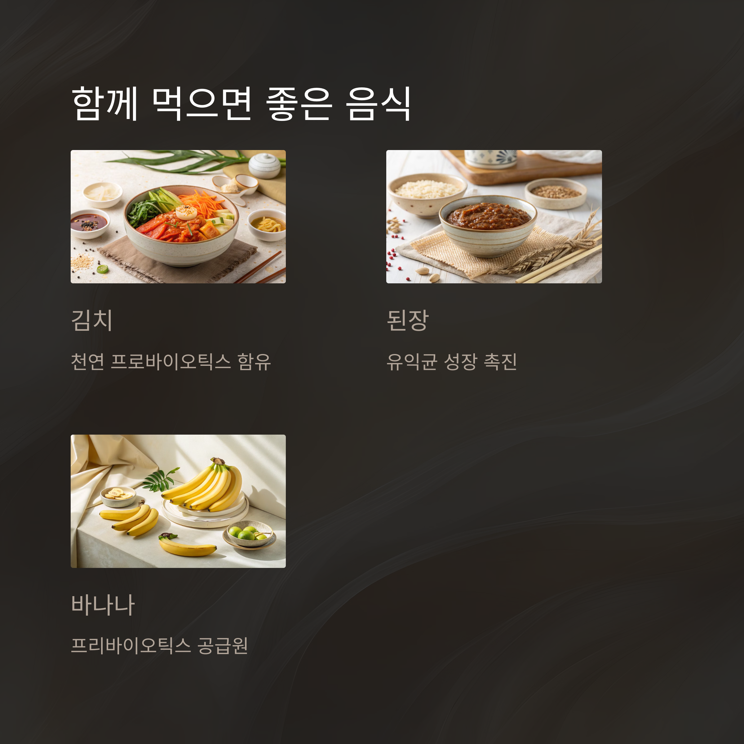 - 요구르트, 김치, 된장 같은 발효 식품