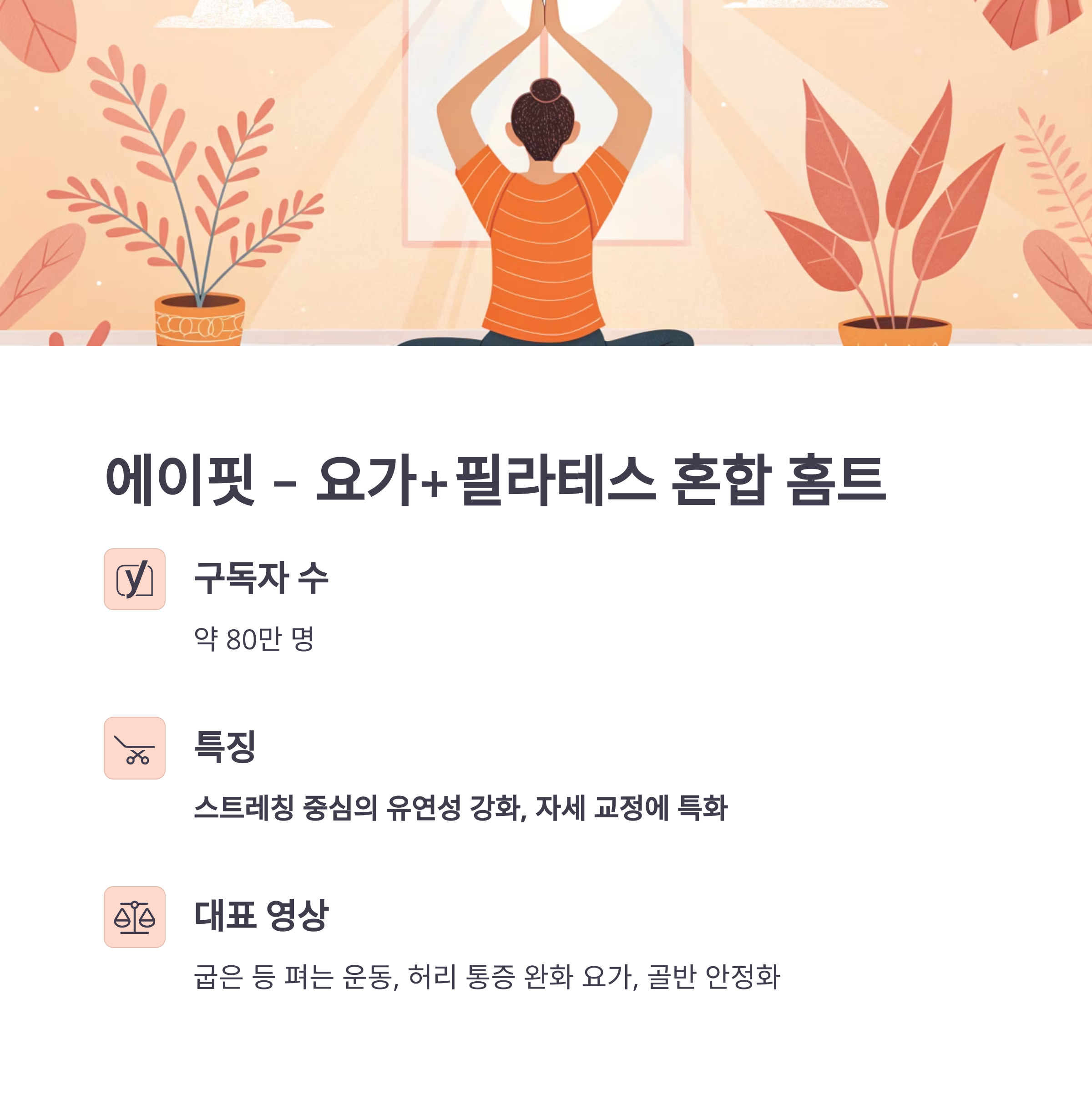 - 특징: 스트레칭 중심의 유연성 강화, 자세 교정에 특화