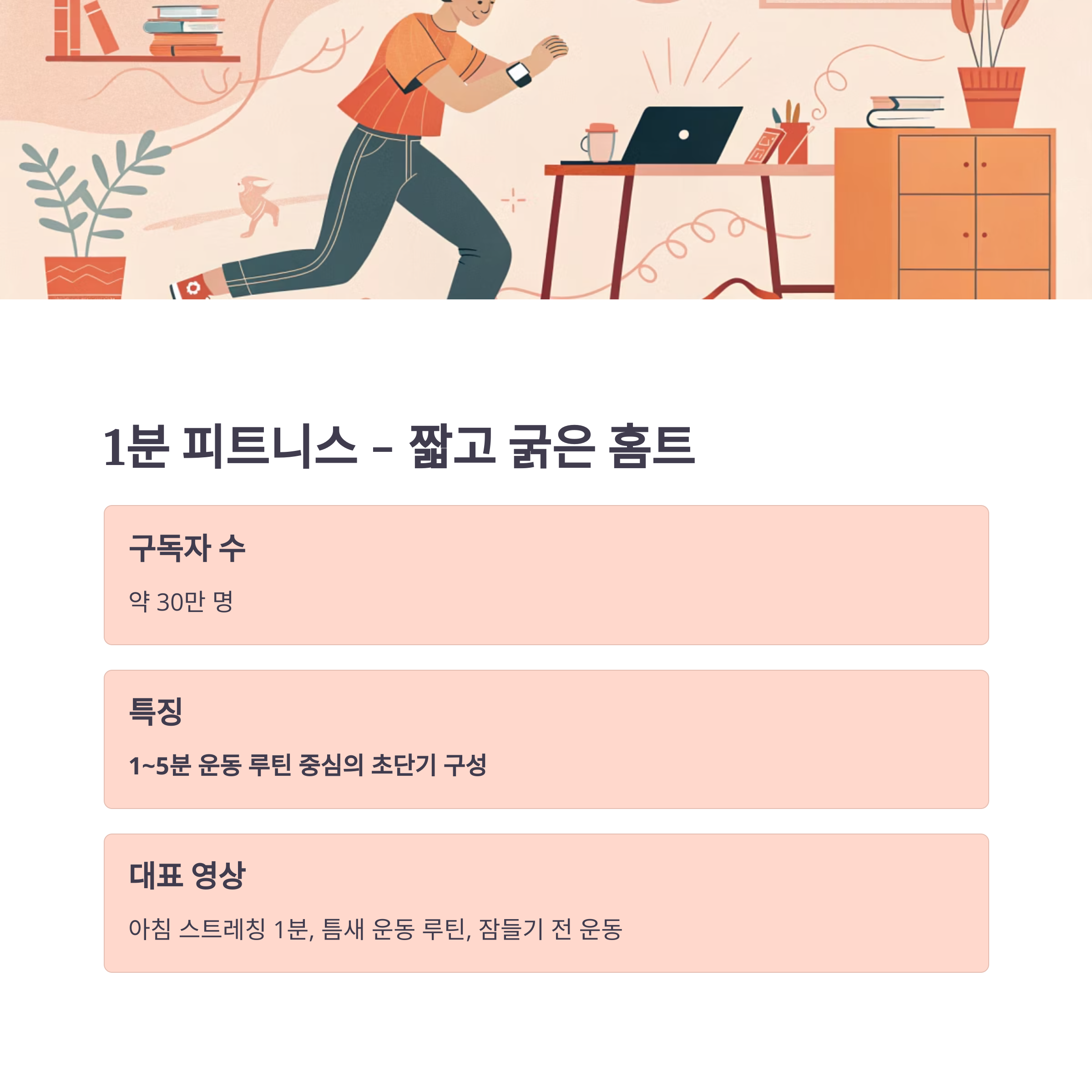 - 대표 영상: 아침 스트레칭 1분, 틈새 운동 루틴, 잠들기 전 운동