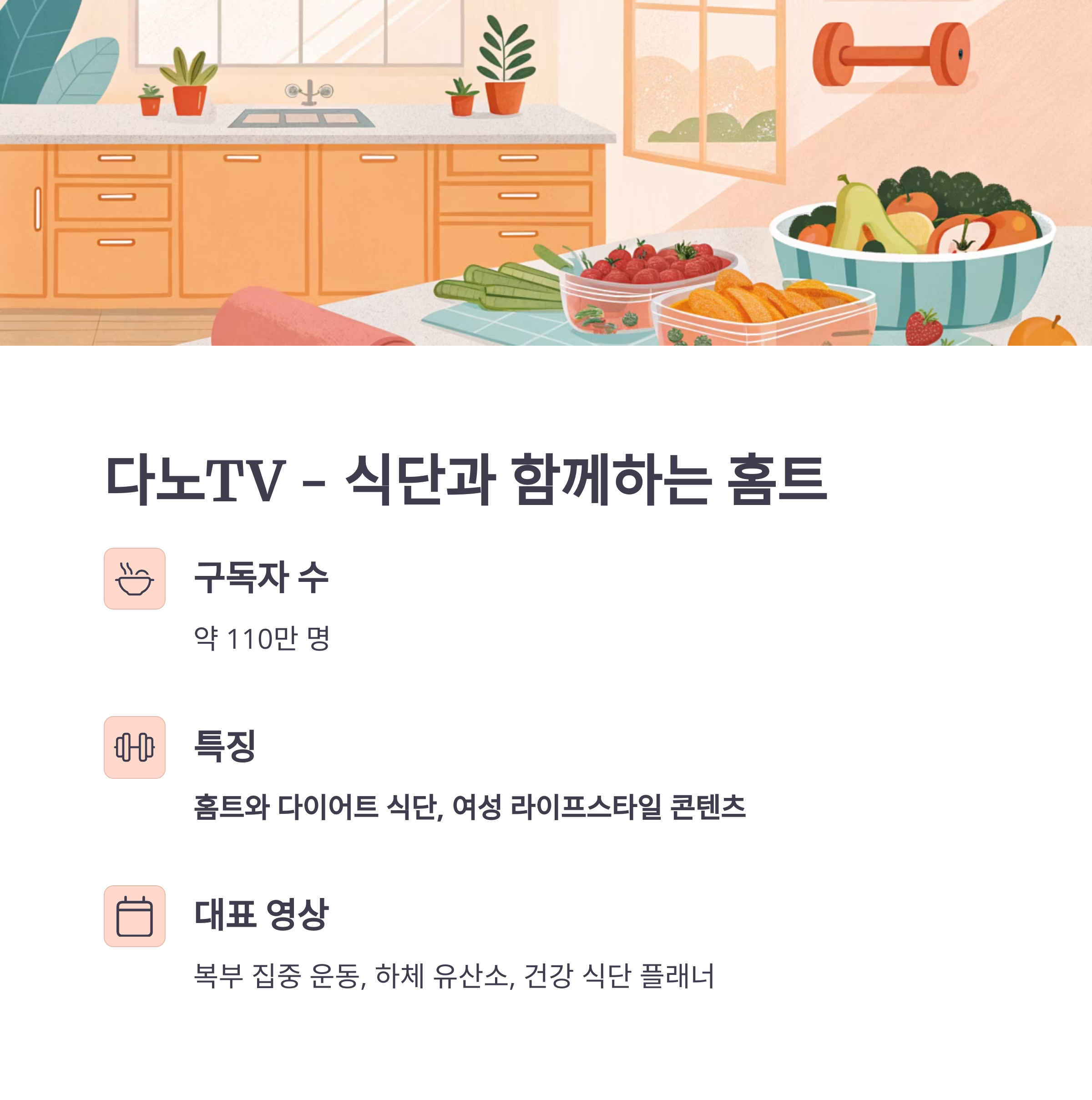 - 특징: 홈트와 다이어트 식단, 여성 라이프스타일 콘텐츠 병행
