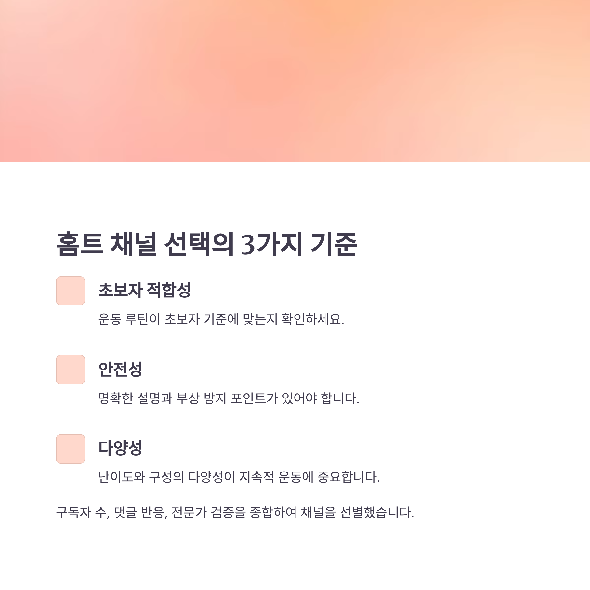 수많은 홈트 채널 중에서 효과 있고 지속 가능한 콘텐츠를 찾으려면, 다음 기준이 필요합니다.